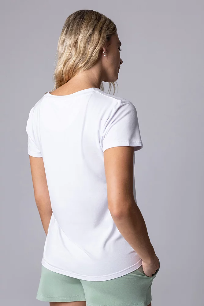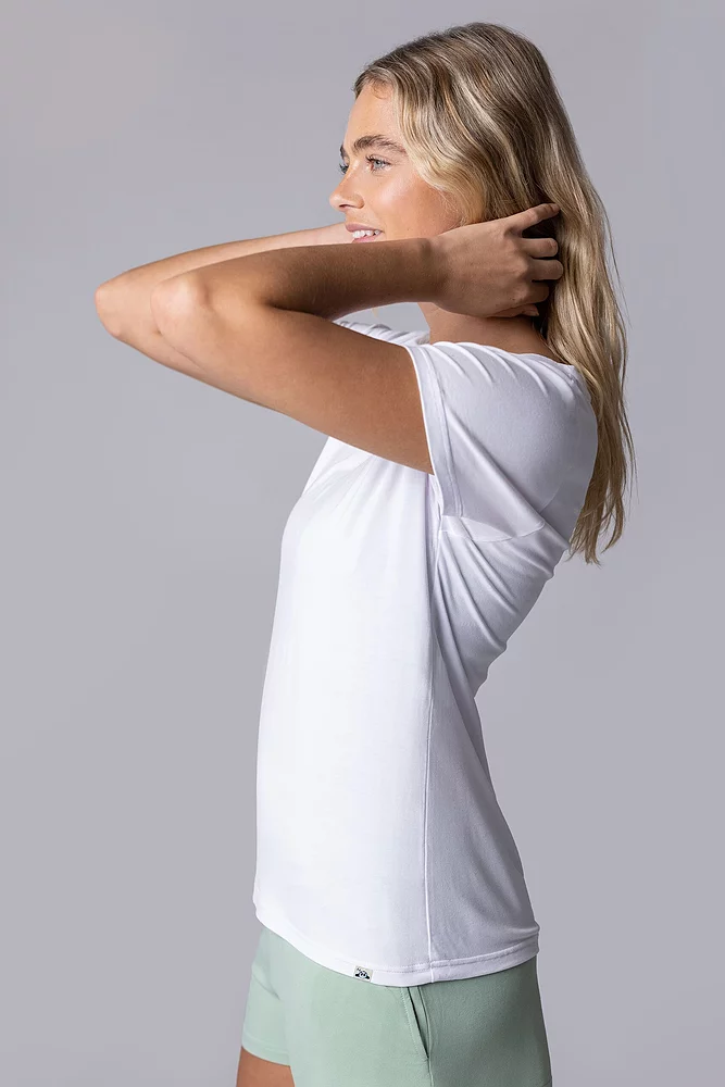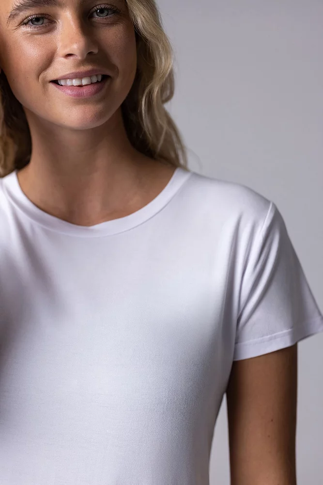 This classic cut, wear-anywhere women’s tee is so soft in pure bamboo fibre with its light, silky-smooth feel. Bamboo’s extra-smooth fibres are hypoallergenic, exceptionally gentle to all skin types and won’t provoke any sensitivities. Because of the bamboo-rich fabric, these t-shirt tops are highly moisture absorbing and breathable. They’ll keep you cool and dry throughout the day so you can stay comfortable and relax, coupled with the natural thermoregulatory properties that let you chill out without ever feeling chilly.
